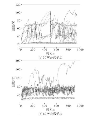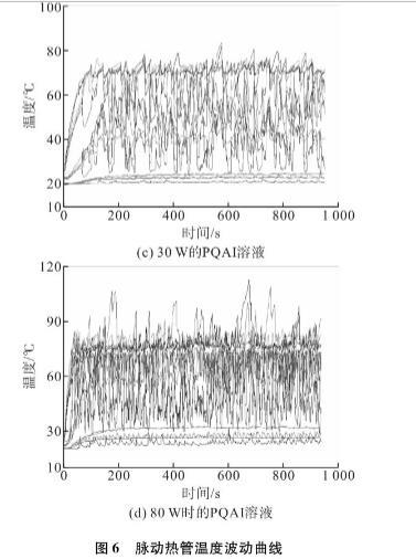 研究了充灌量對脈動熱管運(yùn)行穩(wěn)定性和熱性能的影響,結(jié)果表明50%為最佳充灌率。因此,本文采用了50%的充灌率。圖6顯示了不同加熱功率下采用去離子水或PQAI水溶液脈動熱管的溫度波動曲線。