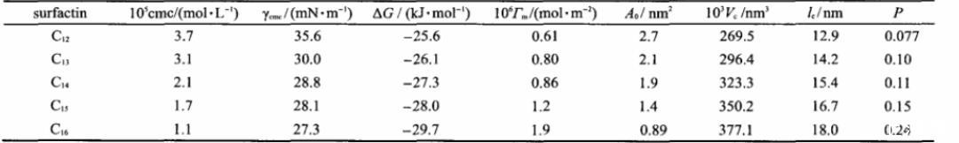 由一系列表面活性素溶液表面和界面活性實驗可以看出,隨著表面活性素脂肪鏈長度的增加,使得表面活性素的表面、界面活性加強,更有助于膠束的形成。