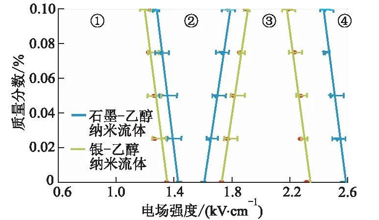 加入納米顆粒后τc/τH的變化如表1所示。納米顆粒的加入使得τc/τH逐漸升高并更接近于1,這表明納米顆粒的加入讓流體表面毛細(xì)波受到表面電荷遷移的阻尼逐漸升高,加速了流體由滴狀模式向紡錘模式的轉(zhuǎn)變,使得模式轉(zhuǎn)變所需臨界電場強(qiáng)度逐漸降低。在質(zhì)量分?jǐn)?shù)相同時(shí),石墨~乙醇納米流體的τc/τH始終小于銀~乙醇納米流體的τc/τH,因此,由滴狀模式進(jìn)入紡錘模式時(shí)石墨~乙醇納米流體所需電場強(qiáng)度更高(圖2區(qū)間①→②)。