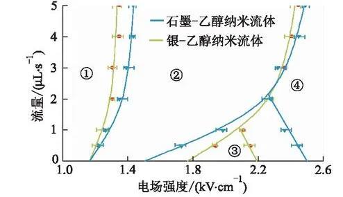 流量是影響納米流體霧化特性的另一重要參數(shù)。尋找在較大流量下依然能保持穩(wěn)定霧化效果的區(qū)間,對工業(yè)應(yīng)用具有十分重要的意義。質(zhì)量分?jǐn)?shù)為0.1%的納米流體在不同流量下霧化模式隨電壓的變化區(qū)間如圖3所示,區(qū)間①為滴狀模式,區(qū)間②為紡錘模式,區(qū)間③為錐射流模式,區(qū)間④為多股射流模式。相同電場強(qiáng)度下隨著流量的增加,單位體積流體荷電量也隨之減小。因此,流體從滴狀模式進(jìn)入紡錘模式所需電場強(qiáng)度逐漸升高(圖3區(qū)間①→②)。由圖3區(qū)間②可知,隨著流量的增大紡錘模式所占區(qū)間逐漸增大。低流速(<2μL·s-1)狀態(tài)下,電場強(qiáng)度增大,流體表面集聚大量電荷,致使液體表面張力降低,霧化模式也就從紡錘模式逐步向錐射流模式過渡(圖3區(qū)間②→③)。納米流體的錐射流模式僅僅發(fā)生在流量低于2μL·s-1時(shí),并且隨著流量的增大,錐射流模式所在區(qū)間迅速減小直至消失(圖3區(qū)間③)。電場對流體荷電的能力有限,流量的增加使得流體不穩(wěn)定性增大,大部分電荷無法聚集至液錐表面,從而導(dǎo)致錐射流模式隨著流量的增大,其霧化區(qū)間迅速消失。