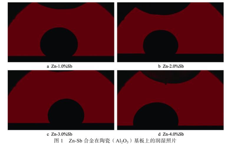 液態金屬表面張力是一個極為重要的物理化學性質,在液態金屬成形加工過程中,表面張力與金屬的流動性及其與金屬基板間的潤濕性密切相關。由于合金熔體與陶瓷的不潤濕性,可以通過計算得到較準確的合金熔體表面張力,并進行不同Zn-Sb合金熔體在陶瓷(Al2O3)基板上的潤濕實驗,圖1為實驗條件下不同Zn-Sb合金熔體在陶瓷基板上的潤濕照片。