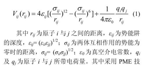 其中,rij為原子i與j之間的距離;εij為勢能阱的深度,εij(εiiεjj)1/2;σij為兩體互相作用的勢能為零時的距離,σij(σiiσjj)1/2;ε0為真空介電常數;qi及qj為原子i與j所帶電荷量。其中采用PME技術模擬分子間長程庫侖作用力,范德華作用截距設定為0.9 nm。此外,本文采用諧波勢能函數模擬鍵拉伸和鍵角彎曲等分子內鍵結作用力。