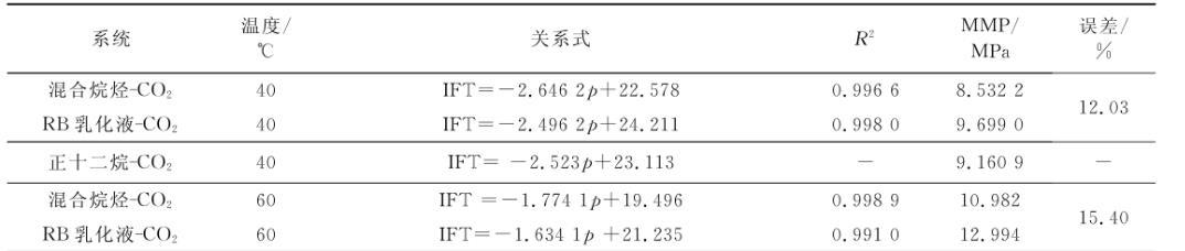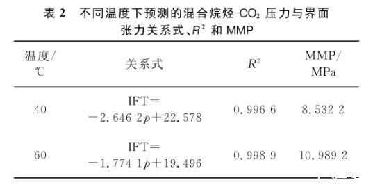 將擬合直線向橫軸方向繼續(xù)延伸,與壓力軸會有一個交點,該交點的物理意義即界面張力為零時的壓力大小。根據(jù)CO2的驅(qū)油機理和最小混相壓力所表現(xiàn)的特征,該點的橫坐標(biāo)值即為實驗對象在特定溫度下的MMP。表2列出了40℃和60℃下所測氣液之間的壓力與界面張力的關(guān)系式和相關(guān)系數(shù),以及對最小混相壓力的預(yù)測。