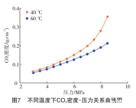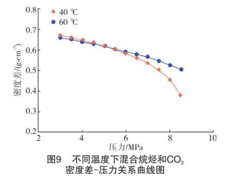 一方面,高溫可以對液體分子之間的相互作用力產(chǎn)生削弱作用,加劇分子間的不規(guī)則運動。此時,CO2氣體分子更容易與液相發(fā)生混溶,而定量表現(xiàn)出來的就是界面張力的降低。另一方面,根據(jù)混合烷烴和CO2的密度和二者的密度差數(shù)據(jù),繪制出不同溫度下CO2氣體密度和氣液密度差隨壓力升高的變化曲線,如圖7~圖9所示。從密度差-壓力曲線(見圖9)來看,隨著溫度升高,在可比較的實驗壓力范圍內(nèi),中低壓(3~6 MPa)下不同溫度的氣液密度差非常接近,可以忽略不計。但高于6 MPa后,高溫下氣液密度差逐漸加大。較高的密度差導(dǎo)致了氣液難以形成混相,同一壓力下界面張力更大。