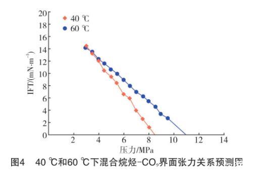 Kazemzadeh Y等的研究表明,平衡的CO2氣-油系統(tǒng)的界面張力通常隨著壓力線性降低,直到界面張力-壓力趨勢發(fā)生變化時,這時的壓力稱為臨界壓力,但界面張力為零的瞬間很難捕捉到。本實驗中,在溫度為40℃、壓力為8.5 MPa時,可以觀察到滴液針管中的混合烷烴不再形成橢圓形液滴,直接和CO2發(fā)生混溶而無斷續(xù)地流入釜中,所以無法通過實驗測量準(zhǔn)確地得到CO2和混合烷烴界面張力為0時的對應(yīng)壓力,即最小混相壓力。因此,采用外推法預(yù)測最小混相壓力。以橫軸為壓力值,縱軸為混合烷烴在被鹽水飽和的CO2環(huán)境下界面張力值的坐標(biāo)系中分別繪制40℃和60℃壓力和界面張力的散點圖,如圖4。從圖4可看出,隨著壓力的升高,界面張力呈線性降低的趨勢。