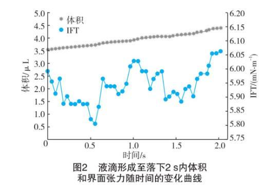 圖2為40℃、6.5 MPa時,液滴形成至落下的2 s內(nèi)液滴體積和測得的界面張力隨時間的變化。由圖2可看出,在落下過程中體積逐漸變大,界面張力誤差在0.3 mN/m之內(nèi),雖然浮動不是很大,但任取一點不能較好地體現(xiàn)整體。因此,選擇在懸滴完全形成開始計算,到完全落下以幀為間隔,因為液滴完全形成時可以較清晰地得到液滴的最大曲率半徑,批量計算這段時間內(nèi)的界面張力值,最后得到其平均值。為避免液滴的隨機性,在每種環(huán)境下選取3個連續(xù)滴落的液滴的平均界面張力值作為最終結(jié)果。減少了實驗的偶然性,使得到的結(jié)果更加可信。