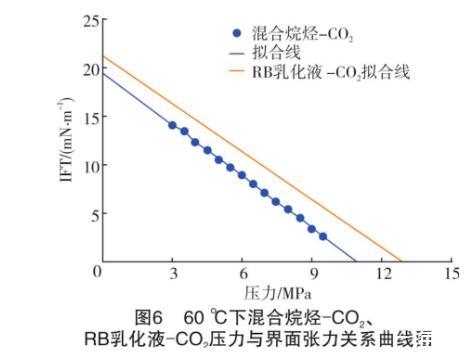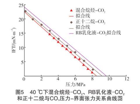 假設(shè)RB乳化液-原油不考慮斜率變化部分,始終以低壓階段(小于6 MPa)的斜率表示界面張力的變化。將表中同一溫度下不同系統(tǒng)的關(guān)系式展現(xiàn)在曲線圖上(見圖5和圖6)。從圖5和圖6可知,不論在哪個溫度下,混合烷烴和RB乳化液的壓力-界面張力曲線都接近平行,即兩種油的界面張力隨著壓力的升高幾乎以同樣的速度降低。計算得知,40℃和60℃下實驗混合烷烴和RB原油的壓力-界面張力關(guān)系式中的斜率誤差為6.0%和8.6%??v觀兩種油的組成發(fā)現(xiàn),本實驗所使用的混合烷烴中正十二烷的摩爾分?jǐn)?shù)達71.07%,而RB原油中的C12+的摩爾分?jǐn)?shù)達到57.66%。也就是說,混合烷烴和原油的組分中占主導(dǎo)作用的是高碳數(shù)的正構(gòu)烷烴。據(jù)姬澤敏等的大量實驗研究,界面張力在不同的正構(gòu)烷烴-CO2體系中具有極好的規(guī)律性,在相同的溫度壓力條件下,正構(gòu)烷烴的碳數(shù)和界面張力成正比關(guān)系。從文獻中RB原油組成分析得知,C12+的分子量高達366 g/mol,而本實驗中的混合烷烴的分子量僅為156.74 g/mol。由此得知,實驗誤差的主要來源是高碳正構(gòu)烷烴的組成不同。