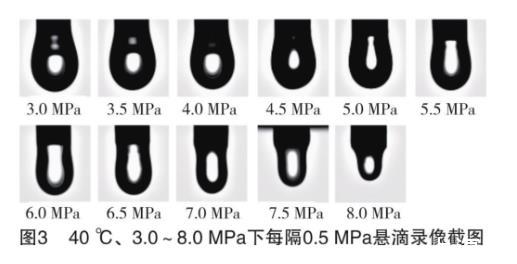實驗后得到的直接數(shù)據(jù)是一系列的懸滴錄像,圖片示例如圖3所示。根據(jù)錄像計算不同溫壓下混合烷烴和CO2的界面張力。