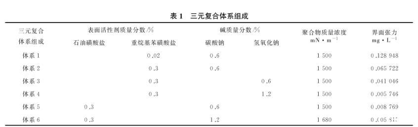 (4)實(shí)驗(yàn)用三元復(fù)合體系的組成見表1,界面張力分布在3個數(shù)量級。