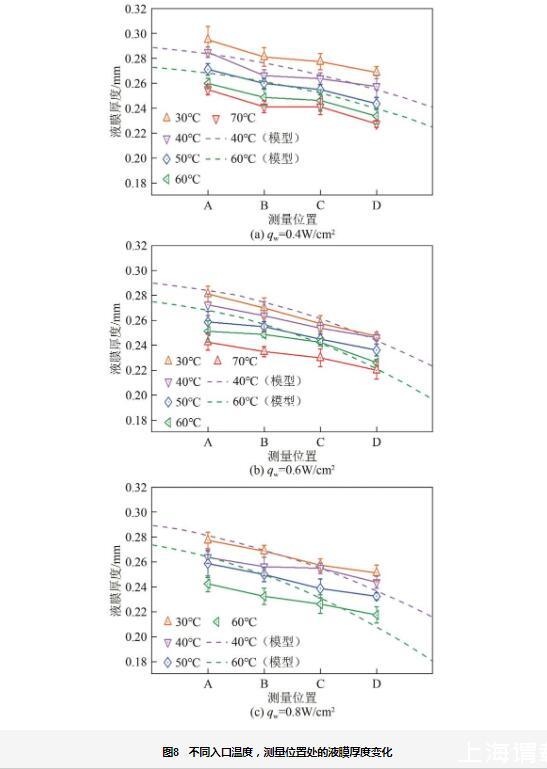 (2)在加熱條件下,研究了不同傾斜角度和噴淋密度下液膜厚度的變化,并解釋了液膜破裂形成干斑區域的機制。該機制是重力、熱毛細效應和蒸發等物理因素共同作用的結果。