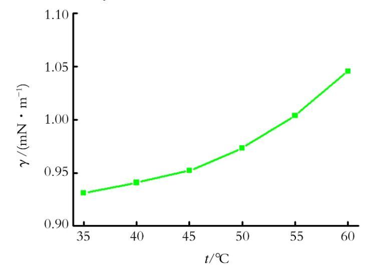 圖3為CPFE質量濃度為40 mg/L時,不同溫度下大慶采油三廠原油體系的油-水界面張力。
