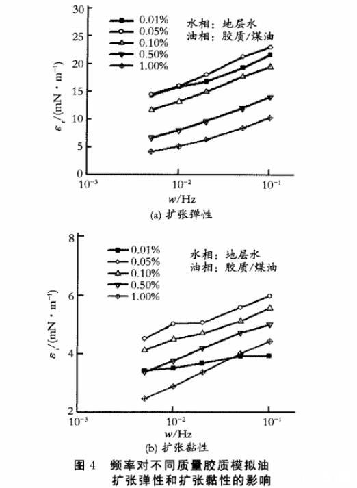 圖4頻率對不同質量膠質模擬油擴張彈性和擴張黏性的影響