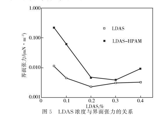 實驗固定聚合物濃度0.12%HPAM,改變LDAS用量,70℃下測試驅油體系與原油之間的界面張力,實驗結果見圖5。