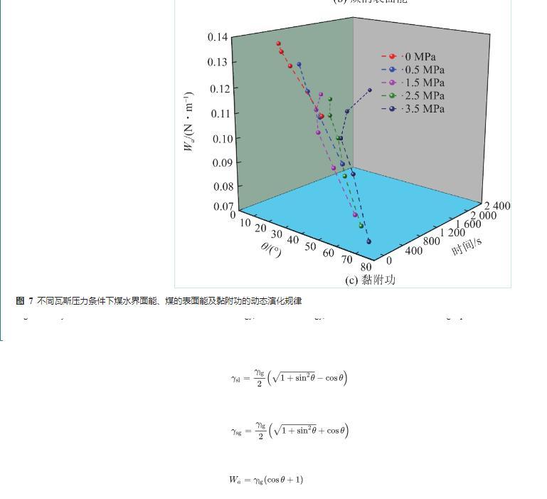 由圖7a可知,同一瓦斯壓力條件下,煤水界面能隨著潤濕時間的增加而減小,隨著接觸角的減小而減小。因為煤水界面能越小,水分越容易在煤體表面鋪展。同一時刻,瓦斯壓力越大,煤水接觸角越大,煤水界面能越大,水分越不容易在煤體表面鋪展;由圖7b可知,同一瓦斯壓力條件下,煤的表面能隨著潤濕時間的增加而增加,隨著接觸角的減小而增大。因為煤的表面能越高,越容易被水潤濕。同一時刻,瓦斯壓力越大,煤水接觸角越大,煤的表面能越小,水分越不容易在煤體表面鋪展;由圖7c可知,同一瓦斯壓力條件下,黏附功隨潤濕時間的增加而增加,隨著接觸角的減小而增大。黏附功越大,越容易被水潤濕。同一時刻,瓦斯壓力越大,煤水接觸角越大,黏附功越小,水分越不容易在煤體表面鋪展。因此,降低瓦斯壓力及延長潤濕時間有助于減小煤水界面能、增加煤的表面能及增加黏附功,進而有助于提高水對煤的潤濕效果。因此,采用煤層注水措施治理瓦斯及預濕減塵時,應給予煤體充分的潤濕時間。