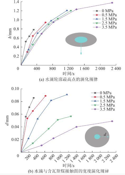 由圖8可知,在一定的瓦斯壓力條件下,隨著時間的增加,水滴逐漸趨向于扁平,水滴與含瓦斯煤的接觸面寬度逐漸增加,即潤濕的寬度逐漸增加,水滴的高度逐漸減小。通過圖8可以獲得,不同瓦斯壓力、不同時間水滴輪廓最高點的坐標,將不同瓦斯壓力、不同時間水滴輪廓的最高點與不同瓦斯壓力、初始時刻水滴輪廓的最高點做差,可以獲得水滴輪廓最高點隨時間的演化規律(圖9a)。通過圖8可以獲得不同瓦斯壓力、不同時間水滴與含瓦斯煤接觸面的寬度,采用不同瓦斯壓力、不同時間水滴與含瓦斯煤接觸面的寬度減去不同瓦斯壓力、初始時刻水滴與含瓦斯煤接觸面的寬度,即可獲得水滴與含瓦斯煤接觸面的寬度演化規律(圖9b)。