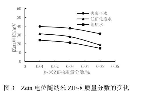 納米ZIF-8流體的穩(wěn)定性是評價(jià)其能否作為驅(qū)油劑的重要性質(zhì)之一。將裝有不同濃度納米流體的樣品瓶靜置15 d后,當(dāng)ZIF-8的質(zhì)量分?jǐn)?shù)為0.01%、0.03%時(shí),納米顆粒在不同礦化度的流體中均保持穩(wěn)定狀態(tài),無沉淀生成,說明適當(dāng)濃度的納米ZIF-8顆粒在水中有著良好的穩(wěn)定性。當(dāng)ZIF-8的質(zhì)量分?jǐn)?shù)為0.05%時(shí),靜置后的納米流體產(chǎn)生了少量沉淀,表明過高濃度的ZIF-8會互相聚結(jié),導(dǎo)致顆粒變大,進(jìn)而發(fā)生聚沉。