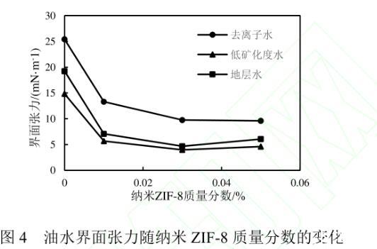 用不同礦化度水制備的納米ZIF-8流體與模擬油間的界面張力隨ZIF-8加量的變化如圖4所示。未加入納米粒子時(shí),3種礦化度水與原油間的界面張力分別為25.41、19.23和14.84 mN/m。適當(dāng)稀釋地層水的礦化度可以降低油水間界面張力,這與文獻(xiàn)報(bào)道的結(jié)果一致。添加0.01%~0.05%納米ZIF-8后,納米流體與原油間的界面張力均明顯降低。其中,納米ZIF-8加量為0.03%的低礦化度水的油水界面張力值為3.97 mN/m,比未添加ZIF-8時(shí)降低了73.25%。這是由于納米顆粒在油水間產(chǎn)生了層狀結(jié)構(gòu),使其在界面上排列更緊密,從而降低了油水界面張力。在模擬地層水中,油水界面張力隨納米ZIF-8加量的增加呈現(xiàn)先降低后增大的趨勢,在加量為0.03%時(shí)達(dá)到最低。當(dāng)ZIF-8加量為0.05%時(shí),流體的穩(wěn)定性變差,部分納米顆粒可能發(fā)生聚沉現(xiàn)象,導(dǎo)致降低油水界面張力能力減弱。