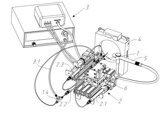 1、雙鞘液管路模塊;1.1、外鞘液不銹鋼管;1.2、內鞘液石英毛細管;1.3、樣品石英毛細管;1.4、三通;1.41、第一T型三通;1.42、第二T型三通;1.5、外鞘液;1.6、內鞘液;1.7、樣品液;1.8、液錐噴霧;2、集成化微流量泵控模塊;2.1、集成化微流量泵控模塊一;2.11、步進電機;2.12、絲桿;2.13、聯軸器;2.14、魯爾接頭玻璃注射器;2.15、圓接頭;2.2、集成化微流量泵控模塊二;2.3、集成化微流量泵控模塊三;3、高壓電勢加載模塊;3.1、高壓輸出導線;4、質譜接口連接模塊;5、數碼顯微鏡組件;6、空間位置微調組件;6.1、三軸臺;6.2、M3螺絲;6.3、T型螺母。