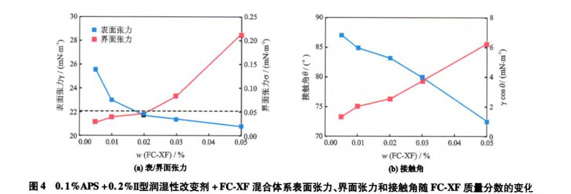 圖4為Ⅱ型潤濕性改變劑質(zhì)量分?jǐn)?shù)為0.2%,APS質(zhì)量分?jǐn)?shù)為0.1%時氟表面活性劑FC-XF濃度對體系表面張力、界面張力和接觸角的影響。