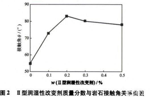 圖2Ⅱ型潤濕性改變劑質(zhì)量分?jǐn)?shù)與巖石接觸角關(guān)系曲線