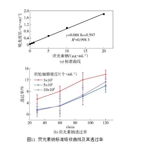 標記物跨膜通量的測定也可以反映單層細胞膜的完整性,熒光素鈉標準吸收曲線及其在不同時間段的透過率見圖11。由圖11(a)的熒光素鈉的標準曲線方程中,代入BL側的吸光度,可計算出BL側的熒光素鈉質量,根據式(4),即可得出不同時間段的熒光素鈉透過率[圖11(b)]。由圖11(b)可知,孵育2 h后,3個不同初始密度的細胞模型均對熒光素鈉具有一定的透過性。初始細胞密度為3×105個/mL的細胞模型對熒光素鈉的透過率相對較高,達到13.96%;初始AP側加入熒光素鈉的密度為20μg/mL,最終3種模型的熒光素鈉透過量均小于0.011 6μg/min,說明3種細胞模型單層膜的致密性能良好。