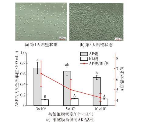 Caco-2細胞培養狀態及培養21 d后的堿性磷酸酶活性見圖10。由圖10(a)、(b)可以發現,培養3 d過程中,單層Caco-2細胞生長穩定并均勻分布在Transwell上,貼壁情況良好。堿性磷酸酶AKP是小腸刷狀緣細胞的標志酶,其濃度代表了單層Caco-2細胞的極化和功能。觀察圖10(c)可知,培養21 d后,不同接種細胞密度在AP側的酶活性均高于BL側的酶活性,屬正常的細胞極化結果。初始密度為3×105個/mL的細胞AP側的AKP活性高于其他兩組,其BL側的AKP活性低于其他兩組,證明該組細胞分化情況較好。隨著細胞密度的增大,AP側與BP側活力的比值呈下降趨勢,說明初始細胞密度過大不利于細胞的分化。實驗結果表明,3種模型細胞均生長良好。