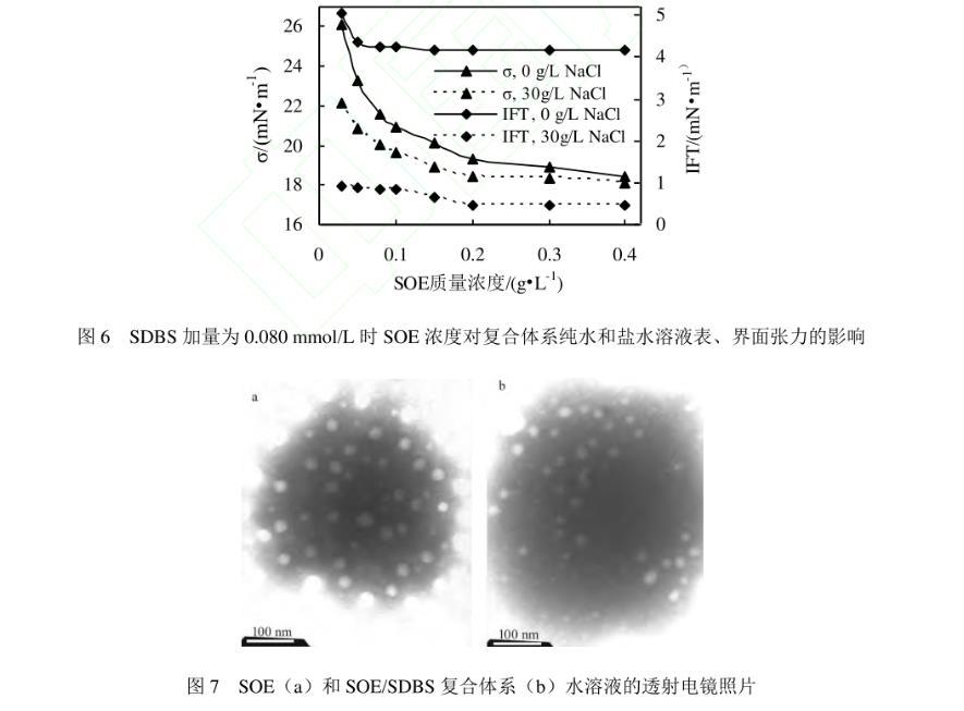 測試發(fā)現(xiàn)十二烷基苯磺酸鈉(SDBS)在純水溶液中的ccmc為0.5 mmol/L(0.174 g/L),該濃度下溶液的表、界面張力分別為27.06 mN/m和0.18 mN/m;SDBS在30 g/L NaCl溶液中的ccmc為0.080 mmol/L(0.028 g/L),該濃度下溶液的表、界面張力分別為27.62 mN/m和0.21 mN/m。因此,選擇與SOE復(fù)合的SDBS的濃度為0.08 mmol/L。