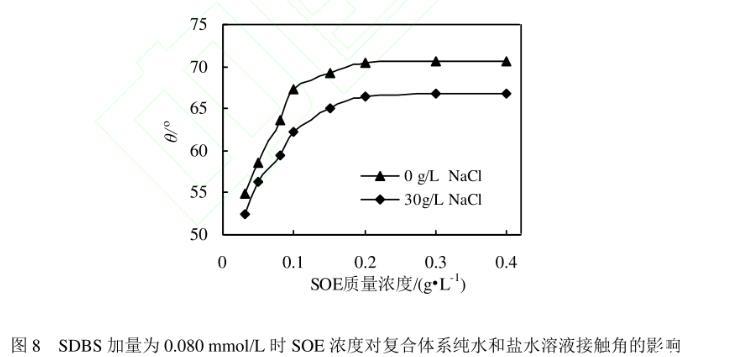 圖8 SDBS加量為0.080 mmol/L時(shí)SOE濃度對復(fù)合體系純水和鹽水溶液接觸角的影響