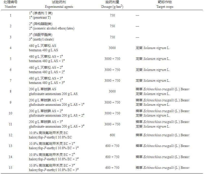 植物葉片性質(zhì)的不同會(huì)影響藥液的潤(rùn)濕和持留能力。接觸角測(cè)定結(jié)果(表3)顯示:無論靶標(biāo)作物是禾本科的稗草還是闊葉科的龍葵,2#增效劑的接觸角均最小,且3種除草劑中添加2#增效劑后接觸角減小的程度最大(6,10,14),添加3#增效劑后接觸角減小的程度最小,因此,2#增效劑減小接觸角的性能最好。