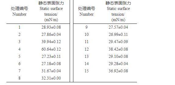 1.2.1靜態(tài)表面張力測(cè)定參照文獻(xiàn)方法測(cè)定。在(25±1)℃下,用0.3 mm的鉑金環(huán)(外徑20.30 mm,周長(zhǎng)61.89 mm,密度0.998 g/mL)在全自動(dòng)張力儀上先用純水進(jìn)行校準(zhǔn),然后測(cè)定表1中15種處理的靜態(tài)表面張力,每個(gè)試驗(yàn)至少重復(fù)3次,結(jié)果取平均值,用Origin Pro軟件(9.0版,OriginLab公司)處理數(shù)據(jù)。