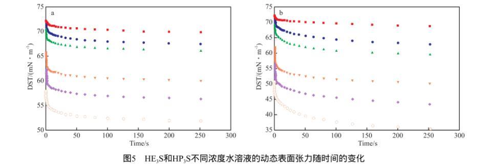 圖5為298 K時不同濃度的HE3S和HP3S水溶液的動態表面張力隨時間的變化。