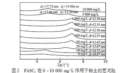 (2)PASC1的插層改變了粘土的層間距,當濃度達到1000mg/L時,層間距d達到最小。