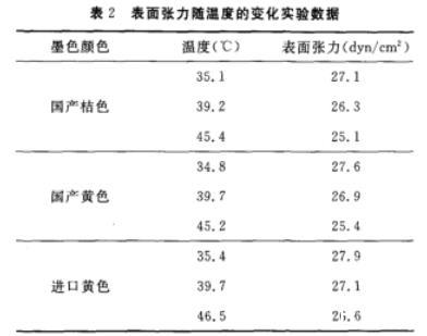 從實驗分析數據得知陶瓷墨水的表面張力隨溫度的升高而下降,但是,在陶瓷墨水的正常使用溫度內(35~45℃)變化不明顯,基本不影響陶瓷墨水的表面張力性能。實驗也得出國產墨水與進口墨水的表面張力參數基本一致,由于表面張力會影響到墨滴的形成狀態,所以國產墨水與進口墨水的打印墨滴基本相接近。