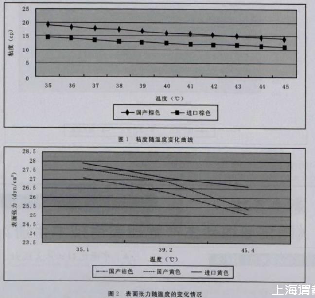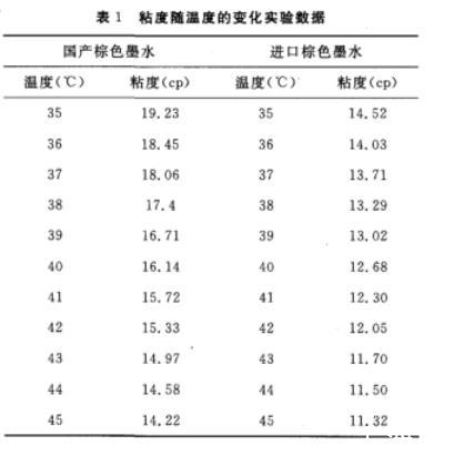 3)進口陶瓷墨水與國產陶瓷墨水相比,內在的性能參數(表面張力、粘度、容重)隨溫度變化的規律一致。