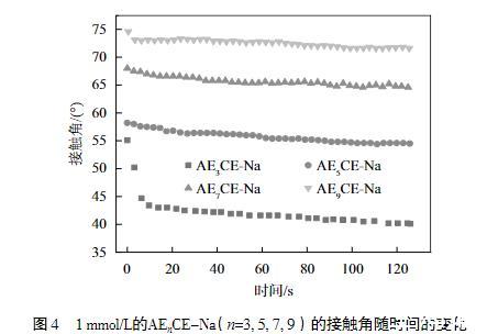 表面活性劑在有效改善疏水固體表面潤濕能力的方面起著至關重要的作用,而潤濕能力的強弱主要通過接觸角來表示。因此,測試了1 mmol/L的不同EO加合數的AEnCE-Na的接觸角隨時間的變化,結果如圖4所示。