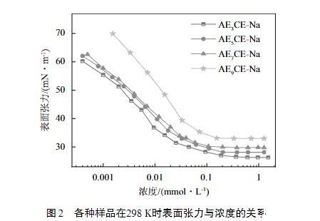 由圖3可以看出,溶液的表面張力都得到了明顯的降低。根據Rosen理論,表面張力隨時間的變化依次可分為誘導區、快速下降區、介平衡區和平衡區4個區域。但在系列AEnCE-Na樣品中,都沒有檢測到誘導區,說明樣品的擴散速率都很快,已經超過了儀器的檢測上線(10 ms)。各個樣品在檢測范圍內最終的表面張力從大到小依次為:AE9CE-Na>AE7CE-Na>AE5CE-Na>AE3CE-Na,該結果與平衡表面張力的變化趨勢相一致。