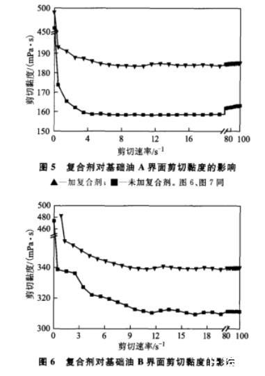 圖6復(fù)合劑對(duì)基礎(chǔ)油B界面剪切黏度的影響