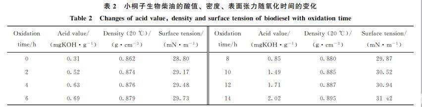 不同氧化時間小桐子油生物柴油的酸值、表面張力與密度的測定結果如表2所示。從表2可得,氧化14h的小桐子生物柴油的酸值由未被氧化時的0.31 mgKOH/g增加到2.02 mgKOH/g,增加了551%,超過ASTM D6751(2001)中規定生物柴油酸值的最大值(0.5 mgKOH/g)。這是由于小桐子生物柴油在氧化后期形成了一些醛類,如己醛和壬醛(見表1),這些醛類經過復雜的二次氧化反應轉化為酸類物質,從而導致酸值增加;同時,生物柴油會吸收水分,導致酯的水解,也可使酸值增加。