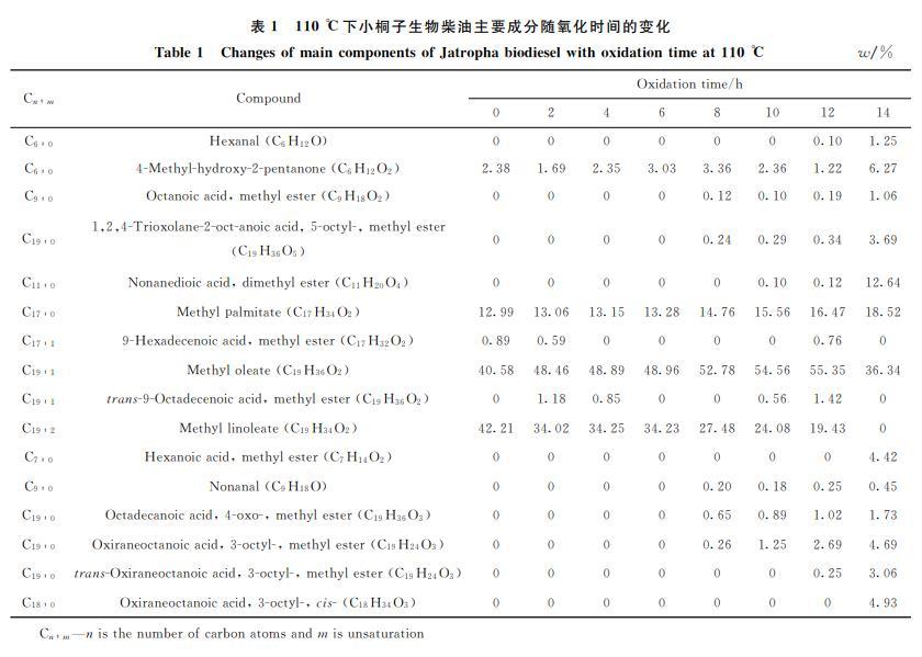 小桐子生物柴油氧化期間GC-MS組成分析結果見表1。由表1可知,小桐子生物柴油的主要成分是棕櫚酸甲酯、油酸甲酯、亞油酸甲酯,歸一化后的質量分數為95.78%。在氧化過程中,含有2個碳碳雙鍵的亞油酸甲酯的含量降低,氧化0h的小桐子生物柴油亞油酸甲酯(C19:2)質量分數為42.21%,加速氧化14h,質量分數為0,說明亞油酸甲酯幾乎完全氧化,這是因為多不飽和脂肪酸甲酯比單不飽和脂肪酸甲酯更容易氧化。與單不飽和脂肪酸相比,亞油酸甲酯的碳鏈含有更多的雙烯丙基位點,雙烯丙基質子對氧自由基的攻擊敏感,導致分子發生氧化,從而形成過氧化合物,過氧化合物進一步氧化轉化成醛、酮等化合物。