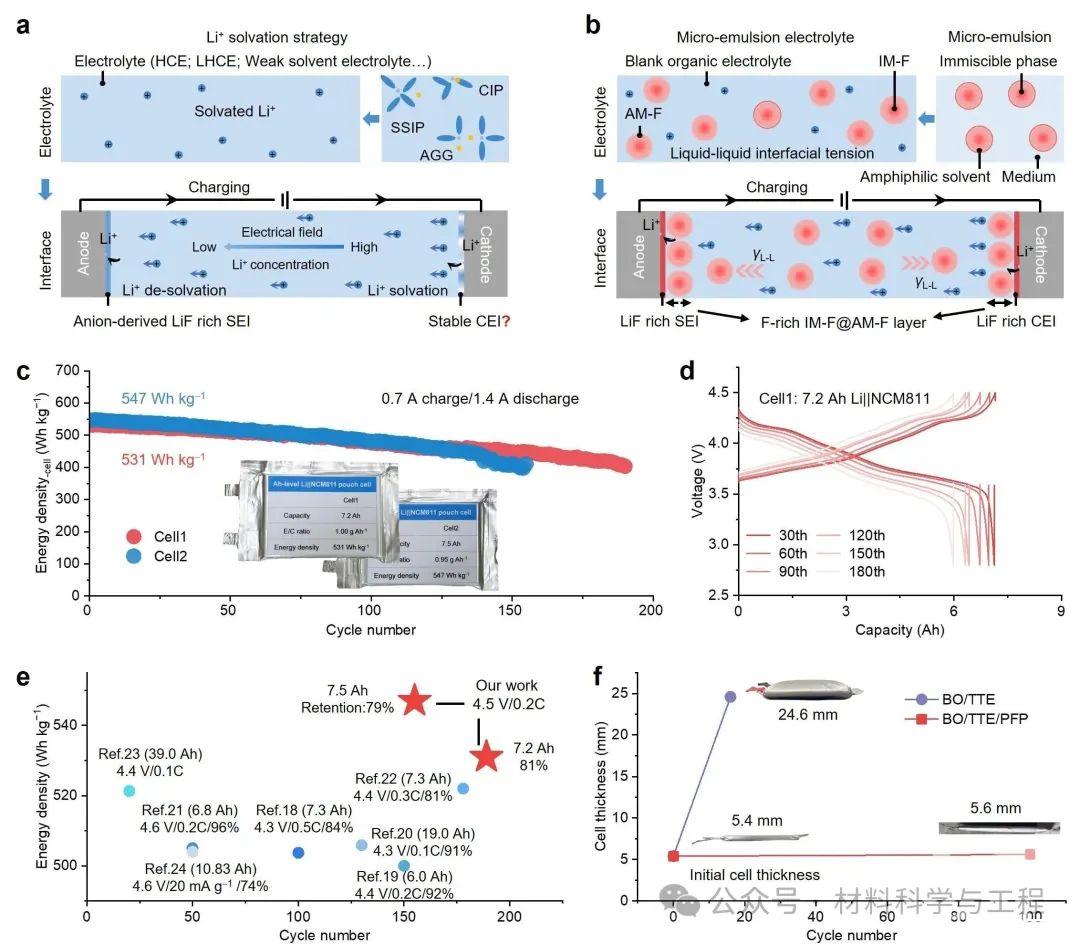 圖1(a)、(b)Li+在充電過程的傳輸行為及正負極界面演化示意圖,對應Li+溶劑化策略(a)和微乳電解液策略(b);(c)Li||NCM811軟包電池在微乳電解液中的循環性能;(d)電池的電壓-容量曲線;(e)本文與報道的電池性能對比;(f)電池在循環前后的厚度變化
