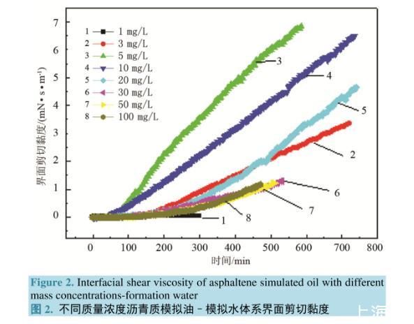 圖2.不同質量濃度瀝青質模擬油–模擬水體系界面剪切黏度