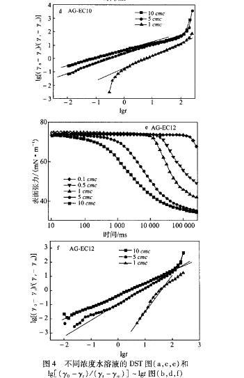 在25cc下測定不同濃度AG.EC水溶液的DST,并利用Rosen模型處理,得到其動態表面張力參數,見圖4、表1。