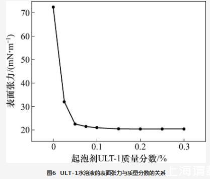 當(dāng)起泡條件相同時,起泡劑水溶液的表面張力越低,發(fā)泡體積越高。配制一系列濃度梯度的起泡劑ULT-1水溶液,利用接觸角/表面張力測量儀采用懸滴法測量表面張力與起泡劑ULT-1質(zhì)量分?jǐn)?shù)的關(guān)系,結(jié)果如圖6所示。從圖6可知:當(dāng)起泡劑ULT-1質(zhì)量分?jǐn)?shù)小于0.05%時,表面張力隨起泡劑ULT-1質(zhì)量分?jǐn)?shù)的提高快速降低;當(dāng)起泡劑ULT-1質(zhì)量分?jǐn)?shù)大于0.05%時,表面張力降幅越來越?。划?dāng)起泡劑ULT-1質(zhì)量分?jǐn)?shù)提高至0.2%時,表面張力降至20.40 mN/m,較蒸餾水降低了71.82%,繼續(xù)提高起泡劑ULT-1的質(zhì)量分?jǐn)?shù),表面張力不再降低。表明新型起泡劑ULT-1在較低濃度時即達到較低的表面張力,有利于提高發(fā)泡體積。