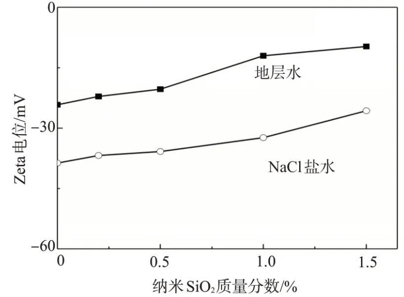 圖2給出了分別用模擬地層水和NaCl鹽水配制的不同納米SiO2含量的納米SiO2/SDS體系的Zeta電位。當納米SiO2的質量分數分別為0.2%、0.5%和1.0%時,用NaCl鹽水配制的納米SiO2/SDS體系的|ζ|均大于30 mV,因而表現出較好的穩定性;而當納米SiO2質量分數為1.5%時,體系的|ζ|略低于30 mV,因此納米SiO2/SDS體系在靜置15 d后才出現輕微的混濁。用模擬地層水配制的納米SiO2/SDS體系的|ζ|均明顯小于30 mV,說明體系的穩定性差,靜置幾小時即出現了渾濁和沉淀。納米SiO2帶負電,金屬陽離子Ca2+,Mg2+和Na+等的存在會壓縮納米SiO2的雙電層,由于Ca2+,Mg2+離子的價數高,壓縮雙電層的能力強,導致體系的|ζ|降低,穩定性變差,由此可見,要使納米SiO2/SDS分散體系具有良好的穩定性,應減少體系中二價Ca2+、Mg2+的含量。
