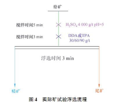 在XFG掛槽浮選機(jī)上進(jìn)行實(shí)際礦浮選試驗(yàn),轉(zhuǎn)速設(shè)為1 992 r/min。每次稱取250.0 g礦樣放入0.5 L浮選槽中,加入0.3 L自來水;綜合考量文獻(xiàn)調(diào)研、純礦物浮選結(jié)果、經(jīng)濟(jì)性等方面因素,確定礦漿pH值等于5為較佳的浮選pH條件。使用H?SO?作為pH調(diào)整劑,調(diào)節(jié)礦漿pH值為5,攪拌礦漿5 min后,加入一定量的DDA或TPA,攪拌3 min后開始用刮板刮出泡沫產(chǎn)品,每間隔3 s刮1次,浮選刮泡時間為3 min。結(jié)束后將得到的泡沫產(chǎn)品和槽內(nèi)產(chǎn)品分別烘干、稱量,測定品位,并計算產(chǎn)率與回收率。實(shí)際礦浮選試驗(yàn)流程如圖4所示。