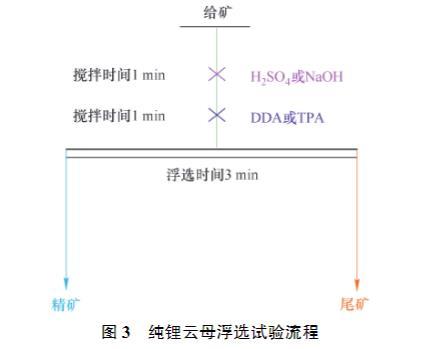 在XFG掛槽浮選機(jī)上進(jìn)行純礦物浮選試驗(yàn),轉(zhuǎn)速設(shè)為1 992 r/min。每次稱取2.00 g純礦物放入50 mL浮選槽中,然后加入40 mL超純水,用H?SO?或NaOH調(diào)節(jié)pH值,攪拌礦漿1 min,加入一定量DDA或TPA,攪拌1 min,保持充氣量恒定,充氣1 min,用刮板刮出泡沫產(chǎn)品,每間隔3 s刮1次,浮選刮泡時間為3 min。結(jié)束后將得到的泡沫產(chǎn)品(精礦)和槽內(nèi)產(chǎn)品(尾礦)分別烘干、稱量、計算回收率。進(jìn)行浮選pH及濃度試驗(yàn)時,每組試驗(yàn)設(shè)置1個平行試驗(yàn),并對浮選結(jié)果求平均值。純礦物浮選試驗(yàn)流程如圖3所示。