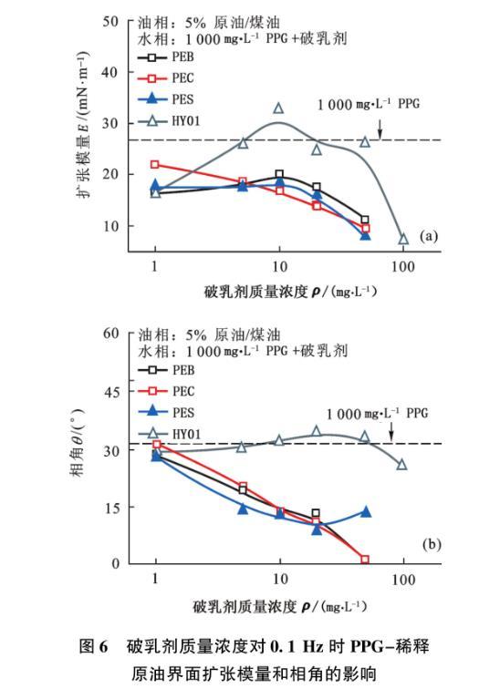 圖6破乳劑質(zhì)量濃度對0.1 Hz時PPG-稀釋原油界面擴張模量和相角的影響