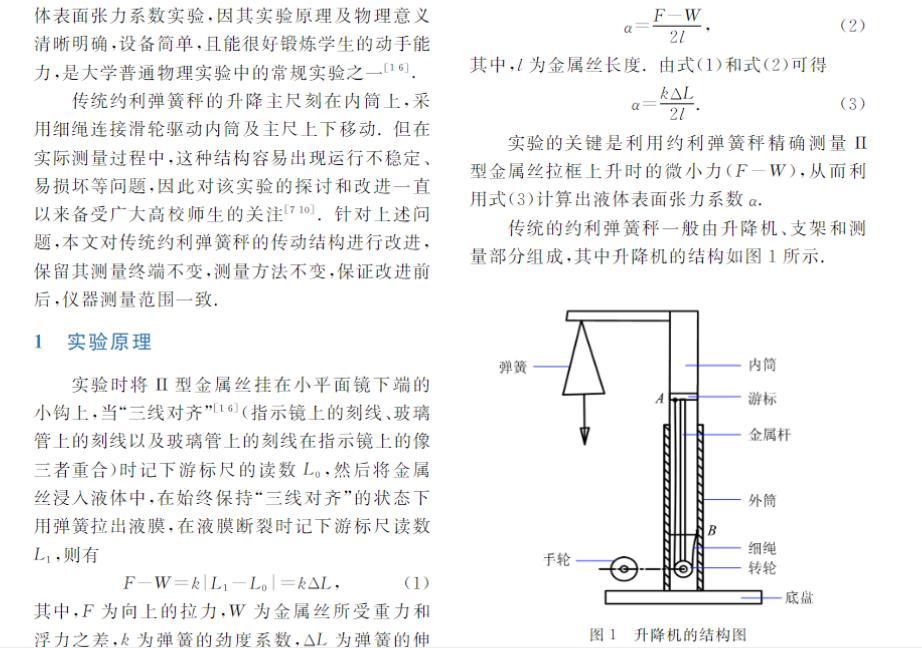 約利彈簧秤是一種精細彈簧秤,常用來測定微小的力。利用約利彈簧秤采用拉脫法測量液體表面張力系數(shù)實驗,因其實驗原理及物理意義清晰明確,設(shè)備簡單,且能很好鍛煉學(xué)生的動手能力,是大學(xué)普通物理實驗中的常規(guī)實驗之一。