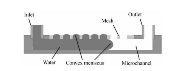 氣溶膠到水溶膠的采樣,一方面要求管道是開放的,以保證空氣中的生物質(zhì)能夠進(jìn)入液體;另一方面為了避免液體在流動過程中外泄,管道必須封閉。本文設(shè)計(jì)了一種開放的管道,其頂部開放面覆蓋有疏水柵網(wǎng),如圖1所示。疏水柵網(wǎng)孔中的水在表面張力的作用下會形成一個(gè)彎月面,阻止水從柵網(wǎng)孔中流出。這樣空氣中的生物質(zhì)就能通過柵網(wǎng)孔進(jìn)入管道,同時(shí)管道中的液體可以穩(wěn)定流動而不會外溢。