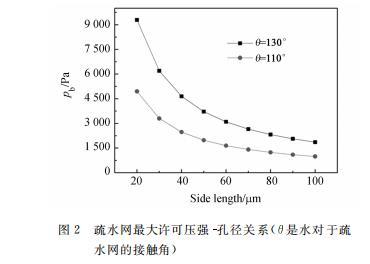 其中:sigma為液體表面張力,a為柵網(wǎng)方孔的邊長,theta為液體對于柵網(wǎng)的接觸角。計(jì)算中假設(shè)水溫為20^{circ}C,此時(shí)水的表面張力系數(shù)sigma=0.0728~N/m(后面計(jì)算中都采用此參數(shù))。最大許可壓強(qiáng)Pb和孔邊長的關(guān)系如圖2所示,可以看到采用疏水性好、網(wǎng)孔小的柵網(wǎng)可以得到更大的Pb。